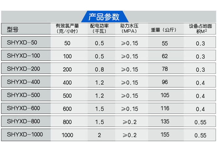 型號 | 氯產量(g/h) | 耗鹽量(Kg) | 功率(KW) | 電源電壓 | 外形尺寸(L×B×H)mm | 管徑(mm) | 重量(kg) | |